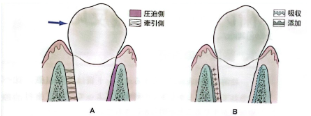 歯に矯正力がかかると、歯根膜が引っ張られる側では骨が生成され、歯根膜が圧迫される側では骨が吸収されます。それによって、歯の周りの歯槽骨が骨吸収と骨添加を少しずつ繰り返します。
